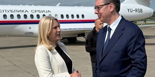 Predsjedavajuća Predsjedništva BiH Željka Cvijanović dočekala je predsjednika Srbije Aleksandra Vučića na banjalučkom aerodromu Mahovljani.