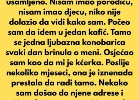 Tamo je upoznao konobaricu čija je ljubaznost imala posebnu toplinu. Iako je bila zatrpana poslom, uvijek ga je pozdravljala s osmijehom i pitala ga kako je. Nije mu samo donosila kafu, nego ga je i slušala, ponekad sasvim kratko, ali dovoljno da osjeti da je nekome stalo. Njemu, koji godinama nije imao nikoga da mu se obrati s pažnjom, ta jednostavna briga značila je mnogo više od jutarnje rutine. Postala mu je poput kćeri kakvu nikad nije imao.