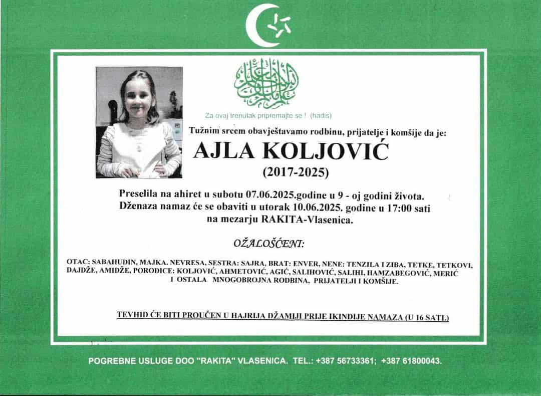 Ajla Koljović, učenica trećeg razreda Osnovne škole „Vuk Karadžić“ iz Vlasenice, preminula je nakon više od mjesec dana teške i hrabre borbe. Imala je samo devet godina.