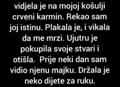 Kada se suočio sa suprugom i priznao joj nevjeru, nije očekivao takav prizor. Nije bilo vikanja, nema bacanja stvari, nema dramatičnih riječi. Samo tišina – duga, bolna i teža od bilo kakvog krika. U njenim suzama, u njenom pogledu punom razočaranja, vidio je ono što ga je najviše pogodilo: shvatio je da ju je izgubio u jednom jedinom trenutku.