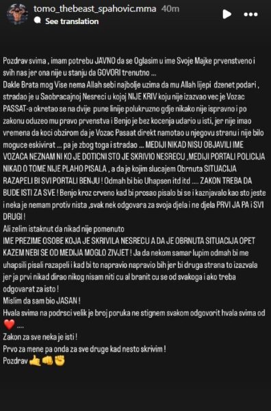 Poznati bh. MMA borac Tomislav Tomo Spahović, poznat i kao “The Beast”, oglasio se na društvenim mrežama povodom tragične saobraćajne nesreće u kojoj je život izgubio njegov brat Benjamin Spahović.